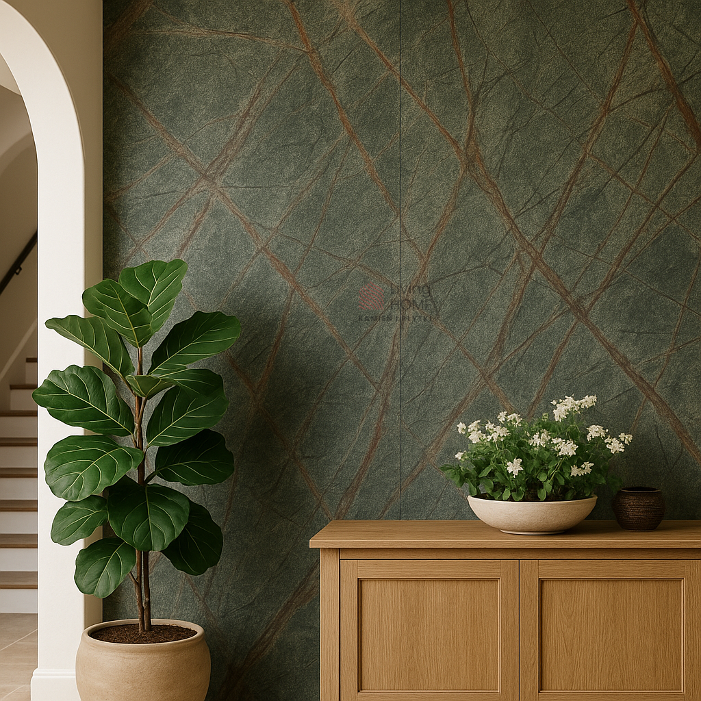 Fornir kamienny SORTE to hołd dla przyrody i bogatej kolorystyki tropikalnych lasów, z intensywnymi odcieniami zieleni i subtelnymi akcentami brązu. Jego tekstura i kolorystyka tworzą atmosferę egzotycznego piękna i unikalnego uroku.